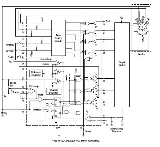 The MC33074AP is one of a series of high performance monolithic DC brushless motor controllers produced by Motorola. It contains all of the functions required to implement a full-featured, open loop, three or four phase motor control system. In addition, the controller can be made to operate DC brush motors. Constructed with Bipolar Analog technology, MC33074AP offers a high degree of performance and ruggedness in hostile industrial environments. The MC33074AP contains a rotor position decoder for proper commutation sequencing, a temperature compensated reference capable of supplying a sensor power, a frequency programmable sawtooth oscillator, a fully accessible error amplifier, a pulse width modulator comparator, three open collector top drive outputs, and three high current totem pole bottom driver outputs ideally suited for driving power MOSFETs.