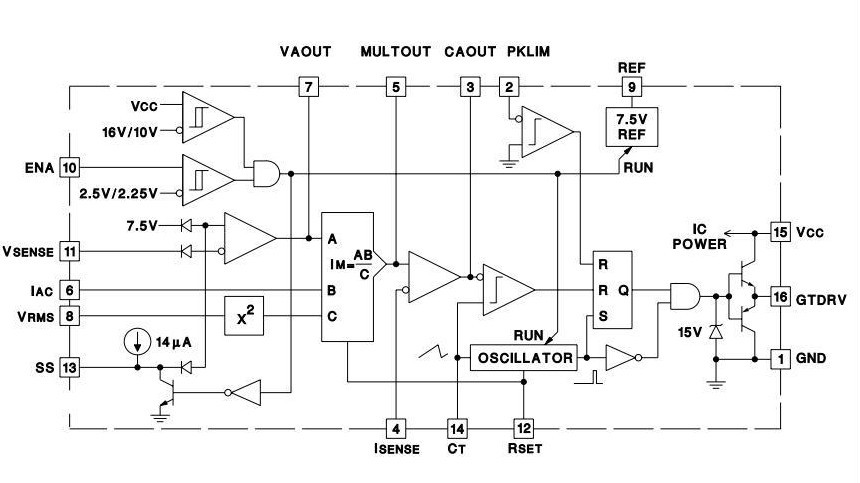 UC3854AN features: (1)Control Boost PWM to 0.99 Power Factor; (2)Limit Line Current Distortion To <5%; (3)World-Wide Operation Without Switches; (4)Feed-Forward Line Regulation; (5)Average Current-Mode Control; (6)Low Noise Sensitivity; (7)Low Start-Up Supply Current; (8)Fixed-Frequency PWM Drive; (9)Low-Offset Analog Multiplier/Divider; (10)1A Totem-Pole Gate Driver; (11)Precision Voltage Reference.